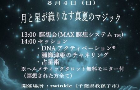 8月4日(日)13:00~ 我孫子市のイベントにタロットで参加します。 セッションを受けていただいた方は、ヘルメティックタロット無料モニターをお付けします。 参加ご希望の方は、お問い合わせからご連絡ください。
